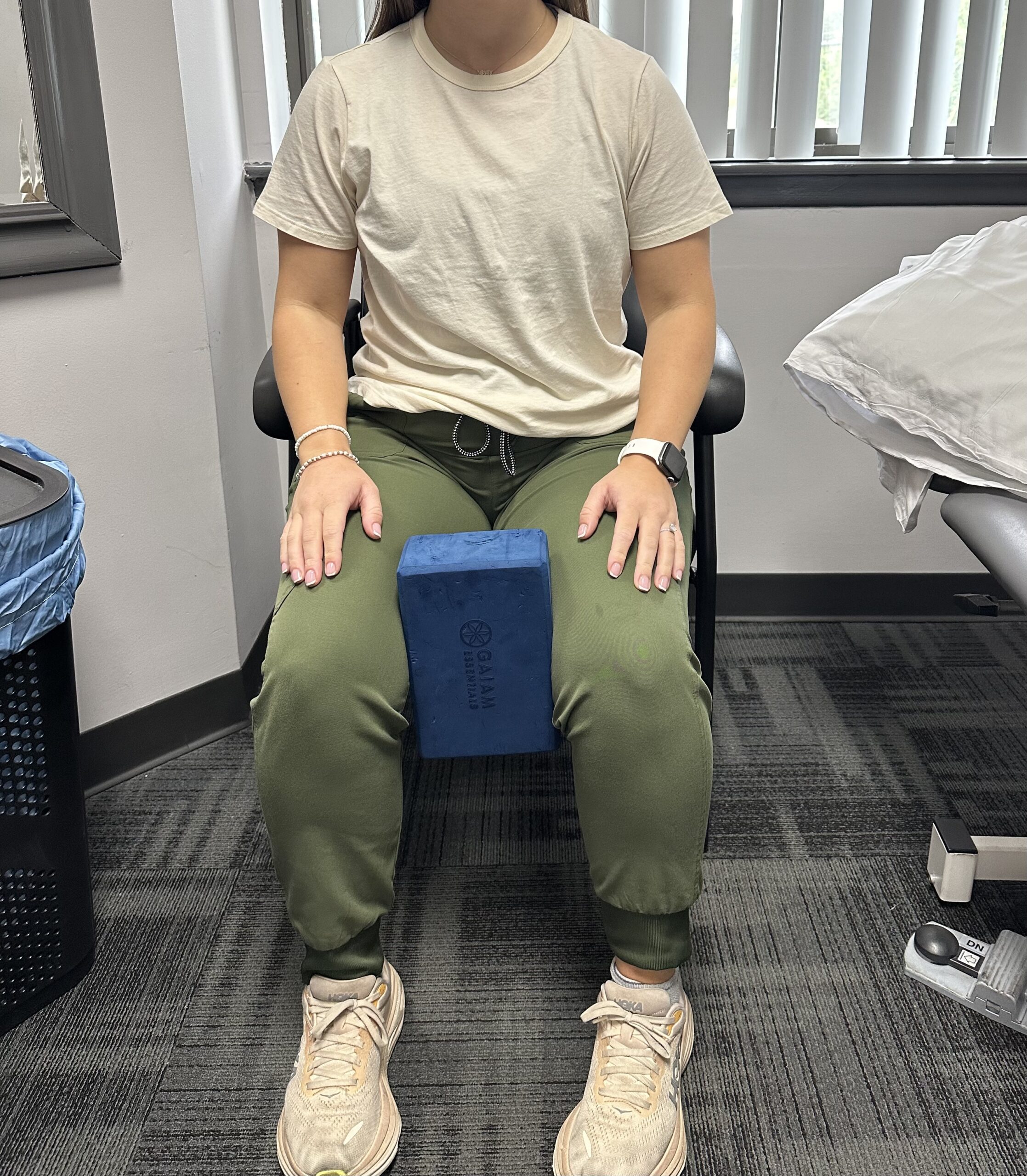 As for changing positions, the goal is to keep the pelvis as neutral as possible and avoid wide leg positions if they increase pain. In regards to exercises to help reduce or manage the pain, core and gentle lower body strengthening is recommended. One of the most important exercises is transverse abdominus (TA) activation or bracing, as this muscle provides stability to the pelvis therefore helping to maintain neutral especially when changing positions. The TA can be activated in any position by drawing the abdomen in as if zippering up a jacket. Another helpful exercise is called the seated hip adductor isometric with a yoga block (or rolled up towel). This can be done in a seated position with good posture, a yoga block between the knees, then by using the inner thigh muscles, squeeze the yoga block gently for 3-5 seconds and repeat 10-20x. It is also helpful to activate the TA prior to performing this exercise. If having any difficulty with either exercise or it is causing more pain, it is encouraged to seek out a pelvic floor PT for assistance, or for a more individualized and/or guided approach for treatment and management of symptoms.