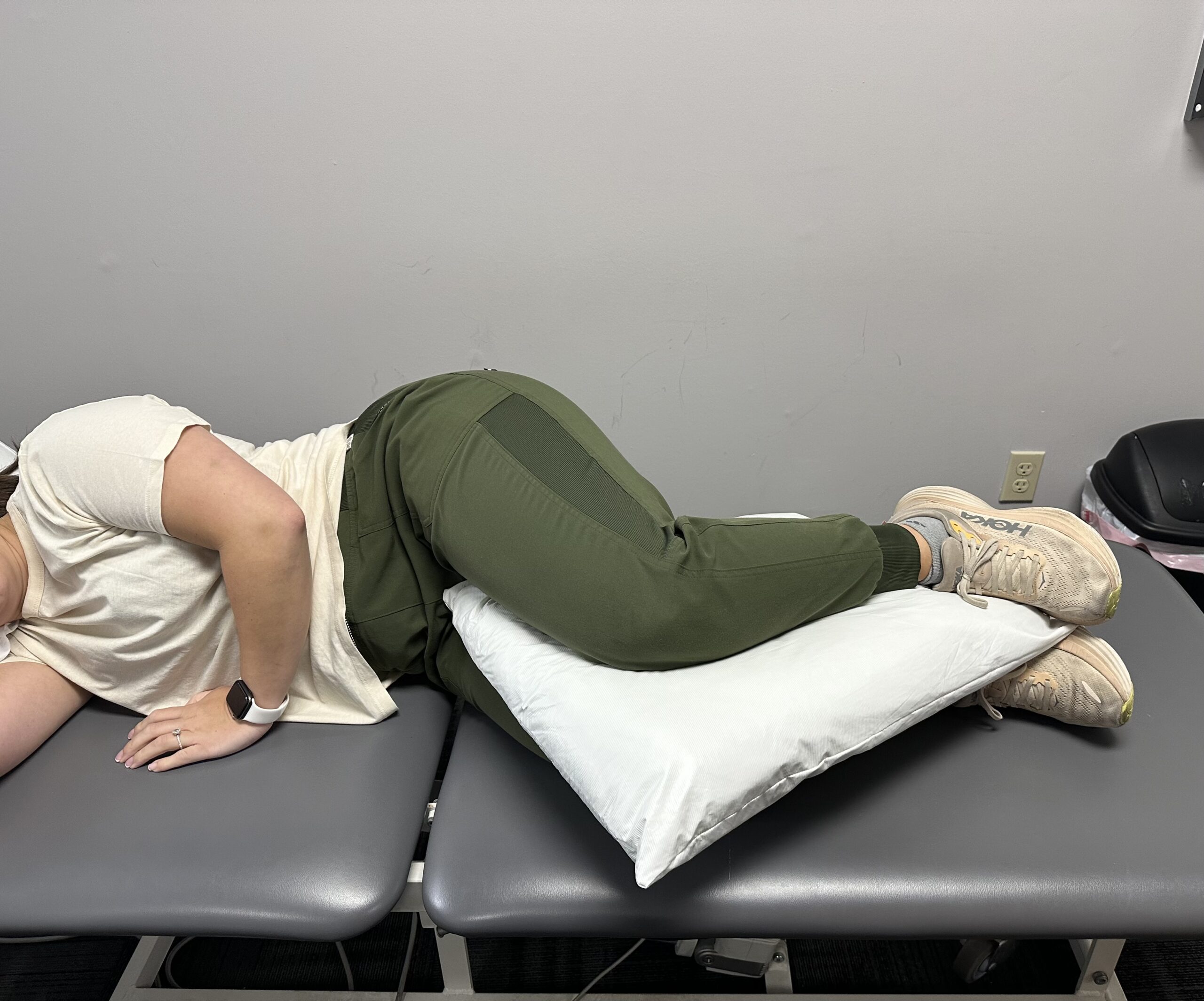 If experiencing pain here, the following include some ideas of things to try to help manage the pain- maintain symmetry of the body and pelvis while sleeping, sitting, and changing positions. While sleeping, placing a pillow between the legs, including knees and feet, can help to maintain a neutral spine (see image to the right). When sitting, keep equal pressure on both sitz bones with pelvis, ribcage, and head/shoulder all stacked and use back support as needed to achieve and maintain neutral.